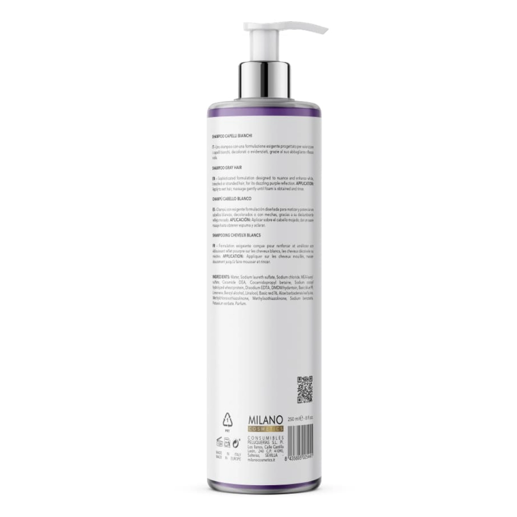 Shampoo con formulazione exigent studiato per esaltare e valorizzare i capelli bianchi, decolorati o evidenziati, grazie al suo abbagliante riflesso viola.